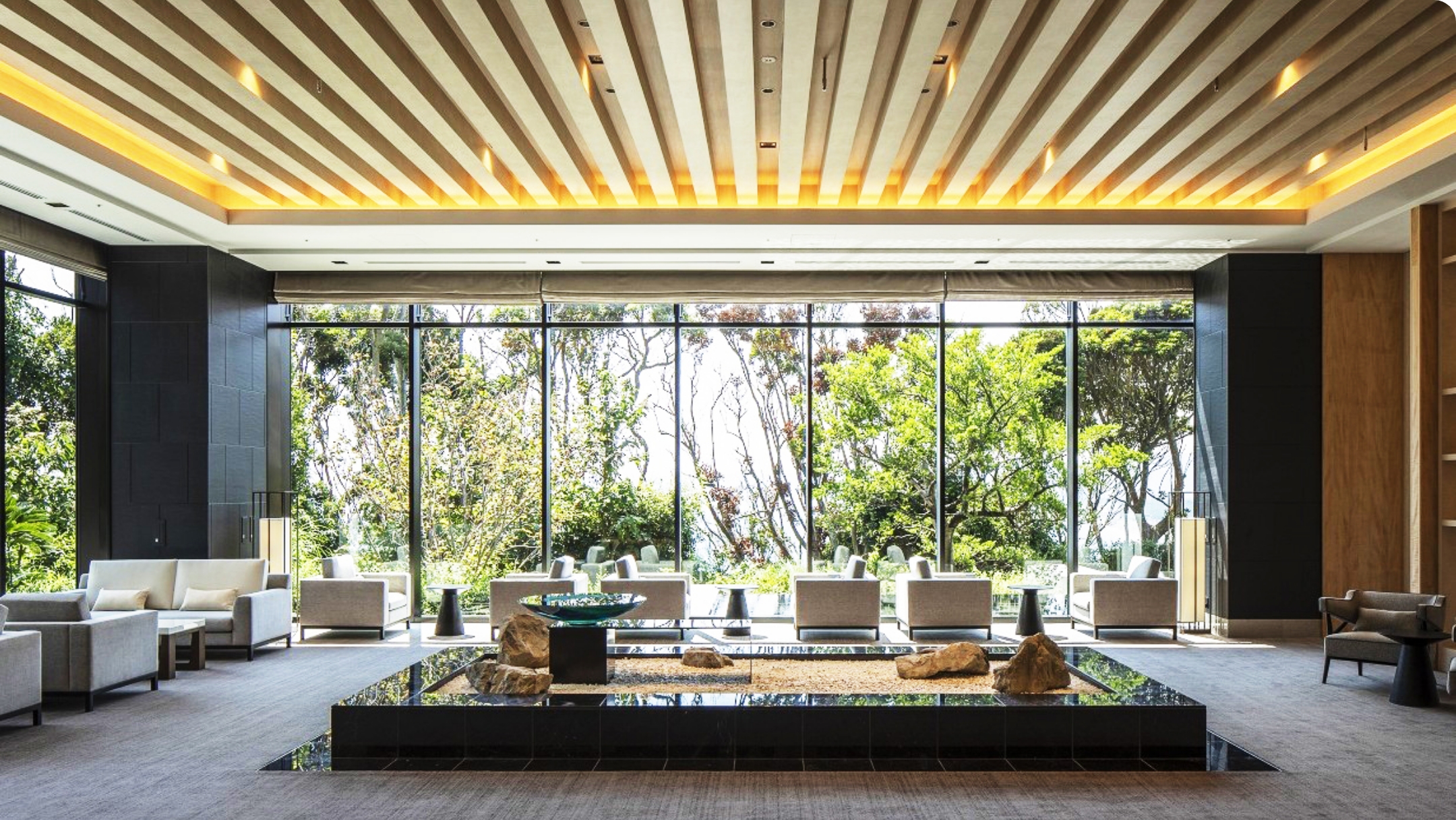 都会の喧騒を忘れさせてくれる上品な邸宅に仕上げました。敷地中央には約1,100本の樹木を植栽したプライベートガーデン「彩の庭」を配し、ダイニング「季響」では壮麗な滝の流れを眺めながら、お食事をお愉しみいただけます。